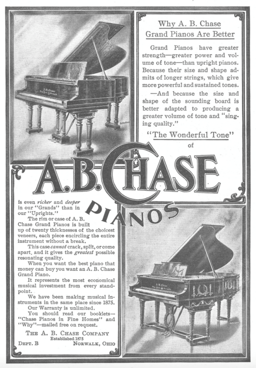 A.B. Chase pianos were produced in both upright and Grand styles, as well as player pianos. Both styles were very high grade and produced a clear, melodic tone. At a time when many pianos lines were being mass-produced, A.B. Chase refused to conform, and thousands of pianists have reaped the rewards of his patience and dedication to “only the best”. [2]