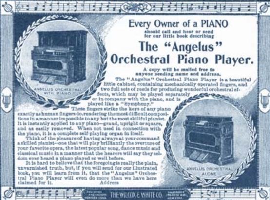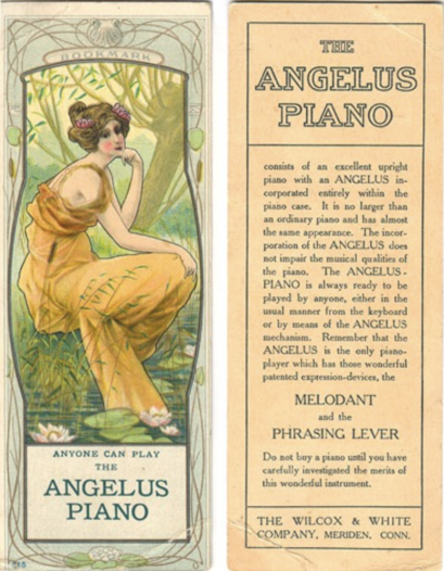 The Angelus was built by several manufacturing companies, starting with the Premier Grand Piano Corporation in the late 1800s until the Great Depression. Also made by Hallet and Davis, and later popularized by the Wilcox and White Company, the Angelus was a reproducing piano with a unique handmade player action that was easily applied to any piano [1]. Wilcox and White produced about 500 Angelus pianos a year out of their Meriden, Connecticut factory, which was situated across the street from their big competitor, the Aeolian Company[2, 3]. The use of the name Angelus was clever marketing, inspired by a French painting that had been in the American news for being bought at a high price in a Paris auction. The Angelus trademark first appeared on player pianos in 1897. [3]