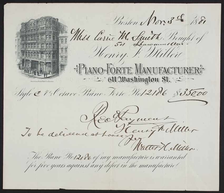 Henry Miller started his piano company in 1863, after several decades working for renowned, contemporary piano manufacturers Brown & Allen in 1850, and the Emerson Piano Company in 1857. As a classically-trained pianist himself, Miller knew learned how to build pianos for the finely-tuned ear of a musician. Miller set up shop in Wakefield, Massachusetts, partnering with the respected piano craftsman at the time, J.H. Gibson. [1]