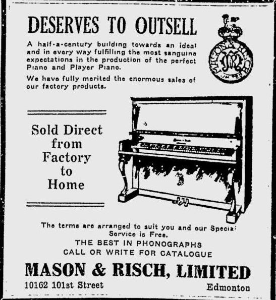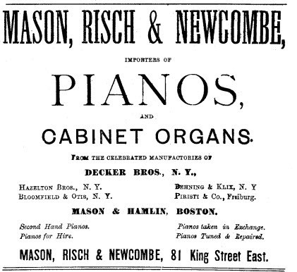 Mason and Risch began in Toronto, Canada in 1871 as Mason, Risch, and Newcombe; however, in 1878 after Octavius Newcombe left to begin his own firm, Thomas Mason and Vincent Rische changed the name to Mason and Risch. The company began by selling others piano lines, but in 1877, they began to produce their own instruments bearing their name.