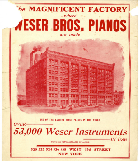 By the 1920’s, Weser Brothers not only manufactured Weser brand pianos, but also Coloniet, Marveola, Re-Rendo, Orpheola, and Winfield pianos. [1] With over three acres of workspace, the Weser factory was large enough to accommodate multiple lines, and had a reputation for only hiring the most skilled craftsmen to build their pianos. [2]