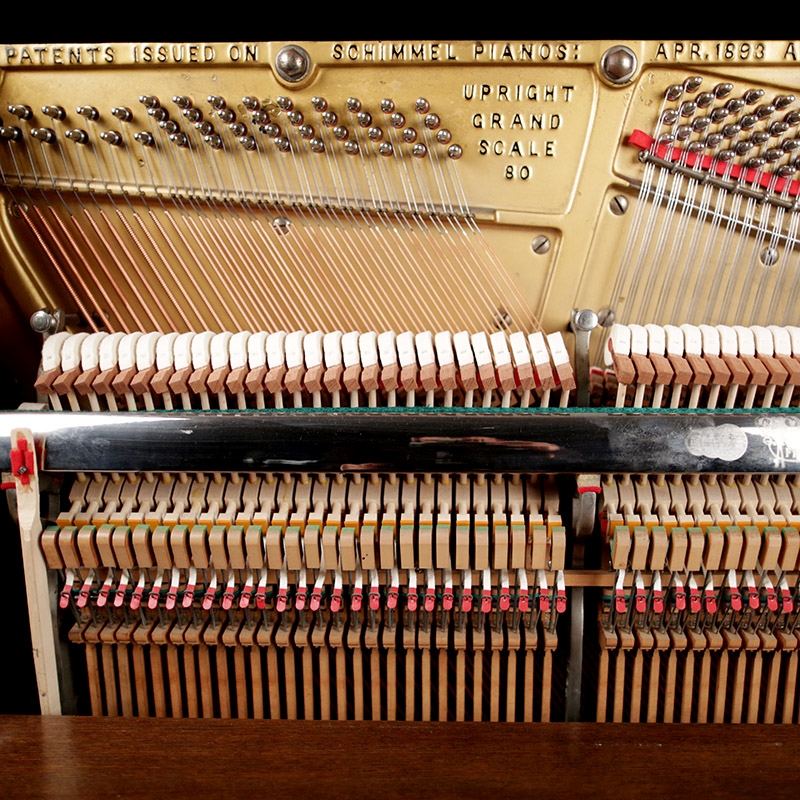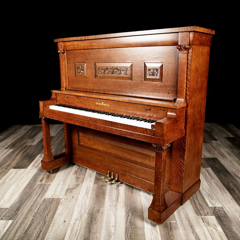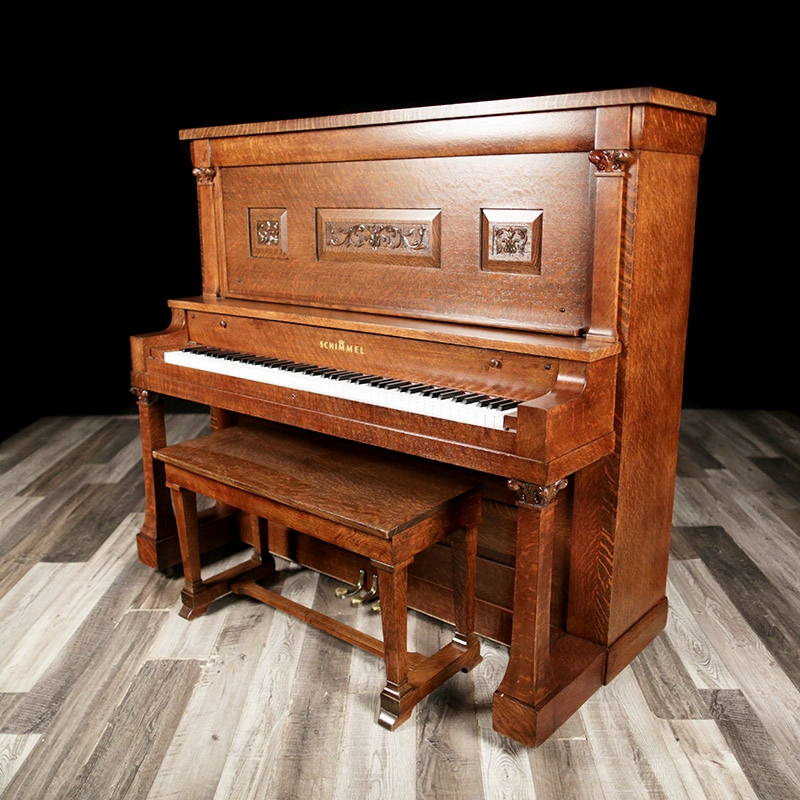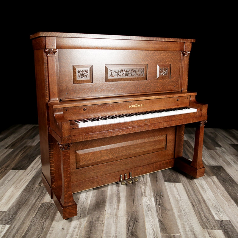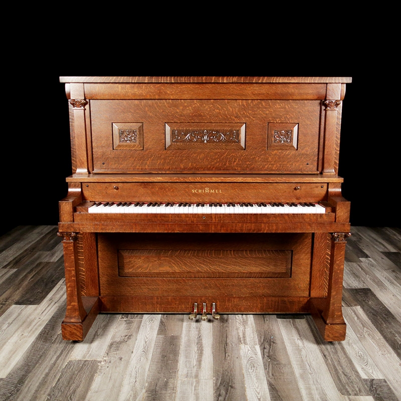This unique and very rare Schimmel Upright has an exotic Tiger Oak case with an exquisite art case. Intricate wood carving throughout the entire case. This is truly a very special piano and restored. View Videos of this piano being played here - Videos